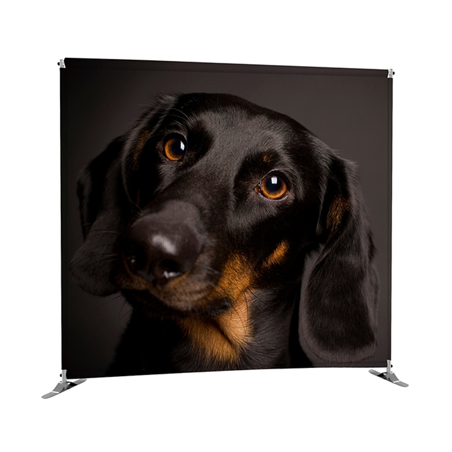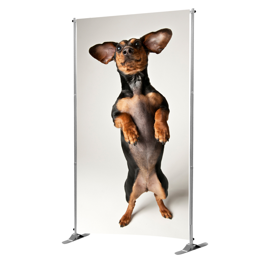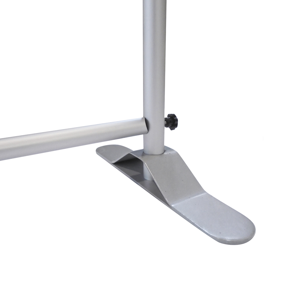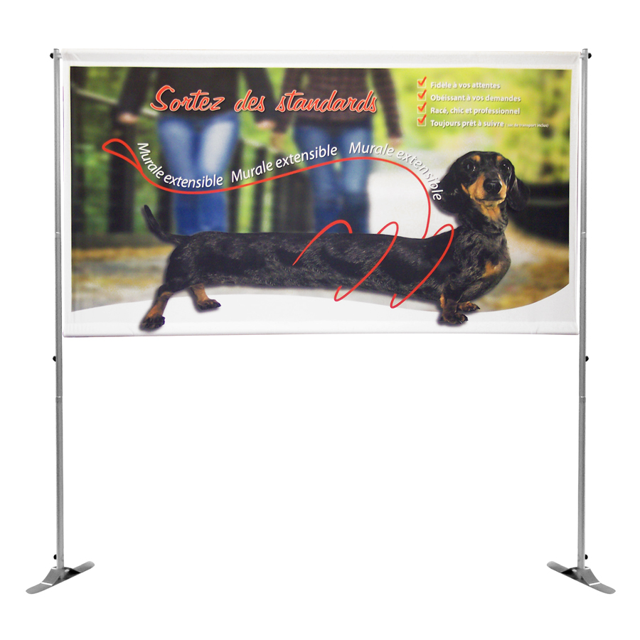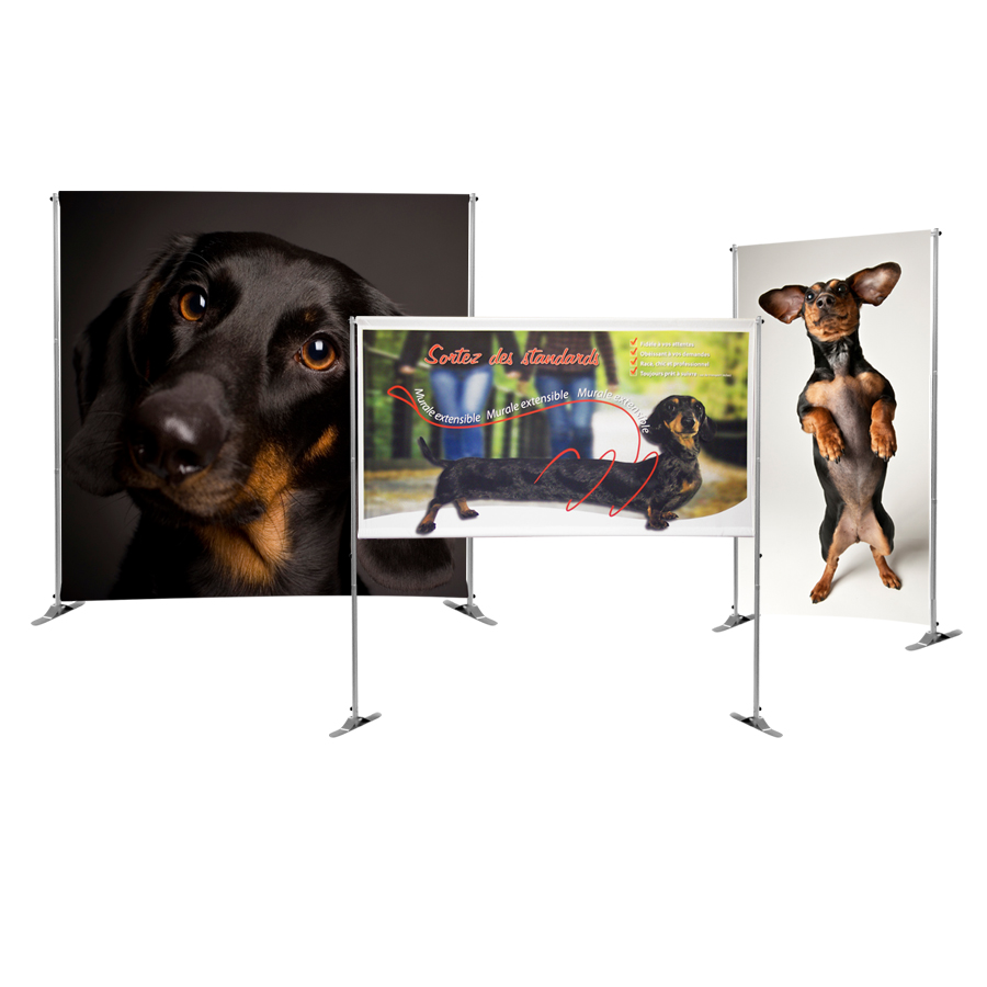 Structure en aluminium avec pôles horizontaux et verticaux télescopiques, pouvant accueillir des visuels aux formats variés.